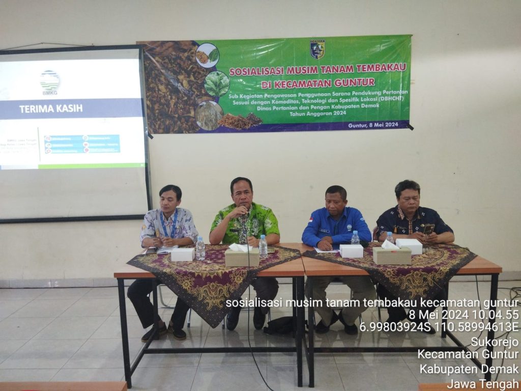 Bekerjasama dengan BMKG Provinsi Jawa Tengah, kegiatan ini bertujuan untuk memberi gambaran prakiraan cuaca dan persiapan tanam tembakau tahun 2024. Rudi Setyo selaku petugas BMKG Provinsi Jawa Tengah dalam paparannya menyampaikan, BMKG memperkirakan musim kemarau di Kecamatan Guntur dimulai pada dasarian I bulan Mei hingga sekitar 13-15 dasarian ke depan, sekitar akhir September 2024.