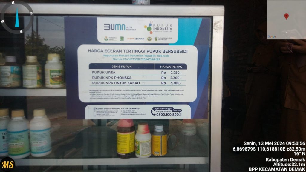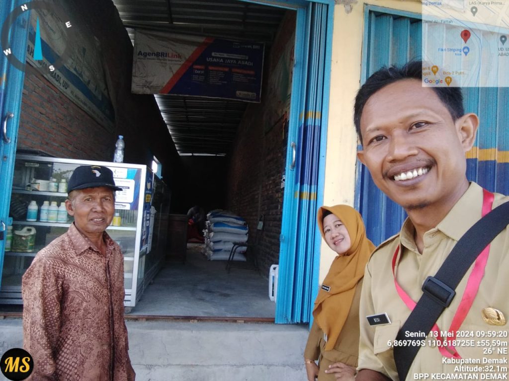 Demak – Korluh BPP Demak Muhammad Sumedi STP, bersama Penyuluh Pertanian Dewi Rommy Anna SPt, Endang Dwi Astuti SP dan Nining Khasanah SPt memonitor gudang dan sejumlah kios pupuk di Kecamatan Demak untuk memastikan kesiapan distribusi dan stok pupuk bersubsidi dan non subsidi guna menjamin ketersediaan pupuk nasional menjelang Musim Tanam II (13/05). Pemilik KPL Usaha Jaya Abadi Kelurahan Mangunjiwan mengatakan bahwa kuota dan penebusan sudah terekam pada kartu tani. Kalau terjadi masalah pada kartu tani, maka masih di mungkinkan di lakukan penyaluran secara manual sesuai syarat dan ketentuan.