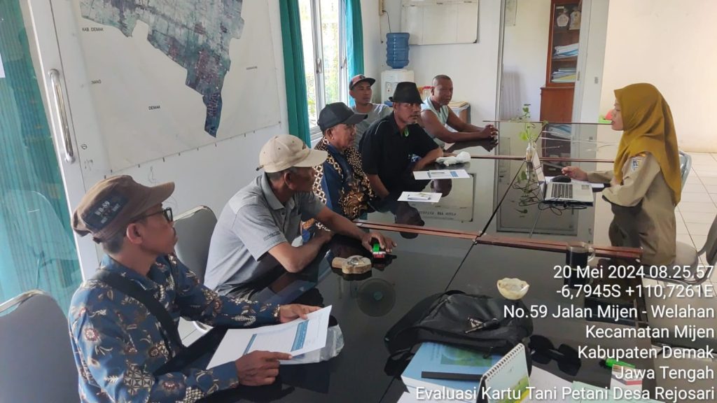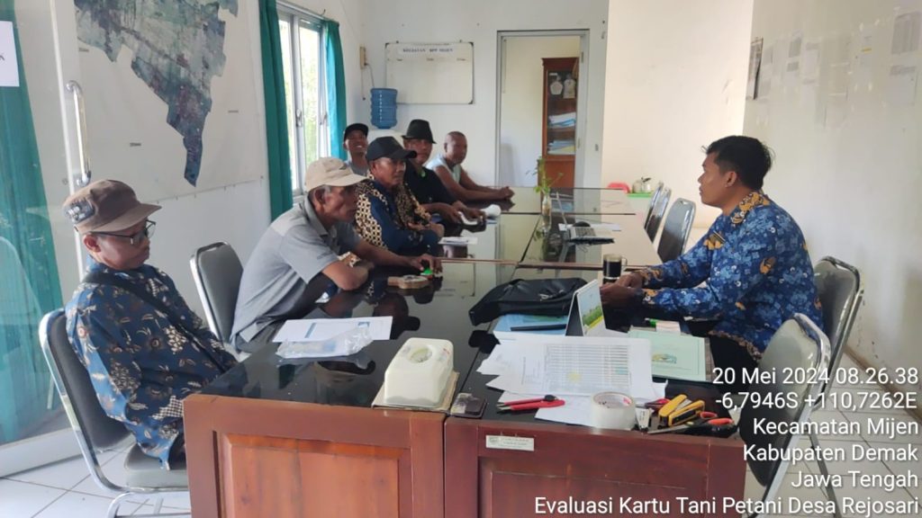 Mijen – An Naas Putra Yuniardi, S.P. selaku PPL Wilbin Desa Rejosari Kec. Mijen beserta PPL Kec. Mijen Annis Rahvita Dewi, S.P. selaku admin petugas Verval Pupuk Subsidi Kec. Mijen dan para Petani desa Rejosari melaksanakan Evaluasi dan Sosialisasi Kartu Tani yang bertempat di BPP Kec. Mijen Kab. Demak, Senin (20/05/2024).
