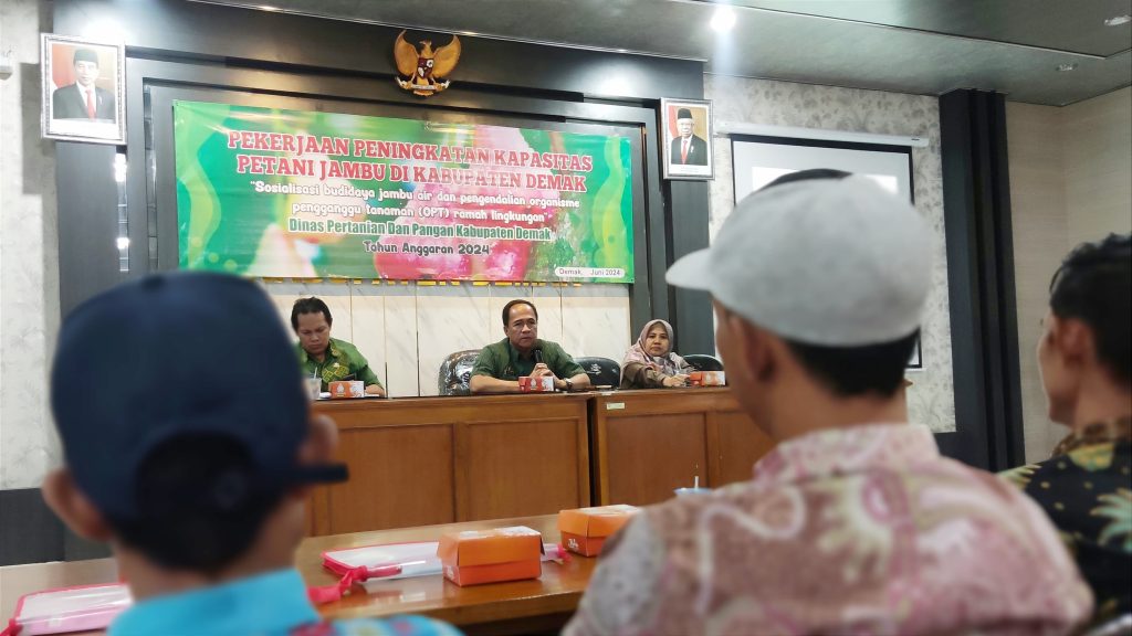 Demak – Kepala Dinas Pertanian dan Pangan Agus Herawan, S.IP, MM., Kabid TPH Heri Wuryanta, STP, MP., BSIP Sri Murtiati, SP, Msi., Ahmad Yunus Wahyu P, M.Pt. selaku POPT Kab. Demak dan petani jambu Desa Tlogodowo serta Desa Sido Mulyo Kec. Wonosalam melaksanakan Sosialisasi budidaya jambu air dan pengendalian OPT ramah lingkungan di Aula Dinas Pertanian dan Pangan Kab. Demak, Selasa (11/06/2024).