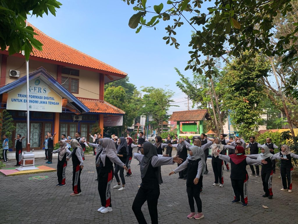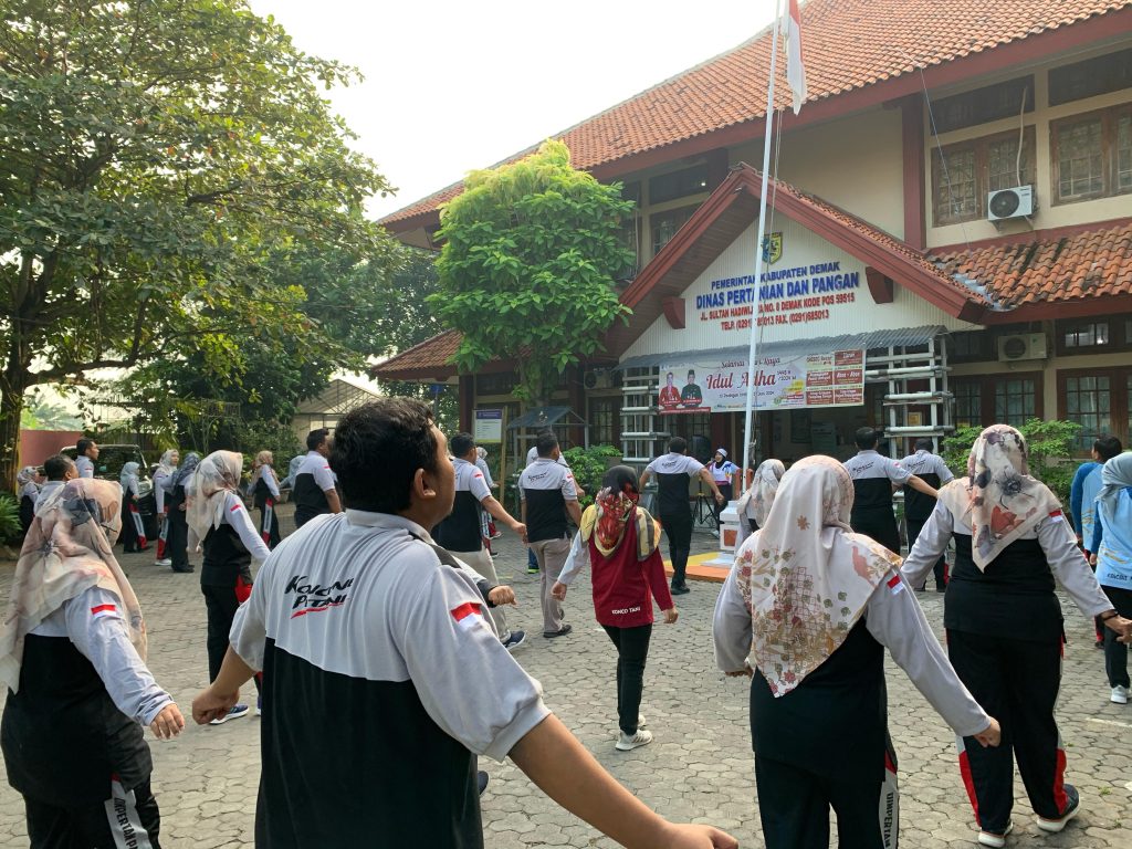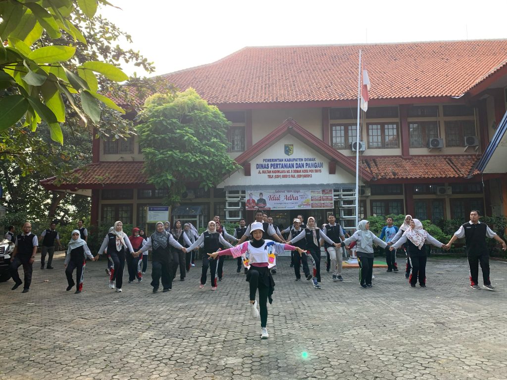 Demak – Pada pagi yang cerah dan segar, suasana di halaman kantor Dinas Pertanian dan Pangan Kabupaten Demak begitu hidup. Para pegawai berkumpul untuk mengikuti kegiatan senam pagi dengan suasana penuh semangat terasa di udara, dengan musik yang riang mengiringi gerakan-gerakan senam yang energik.