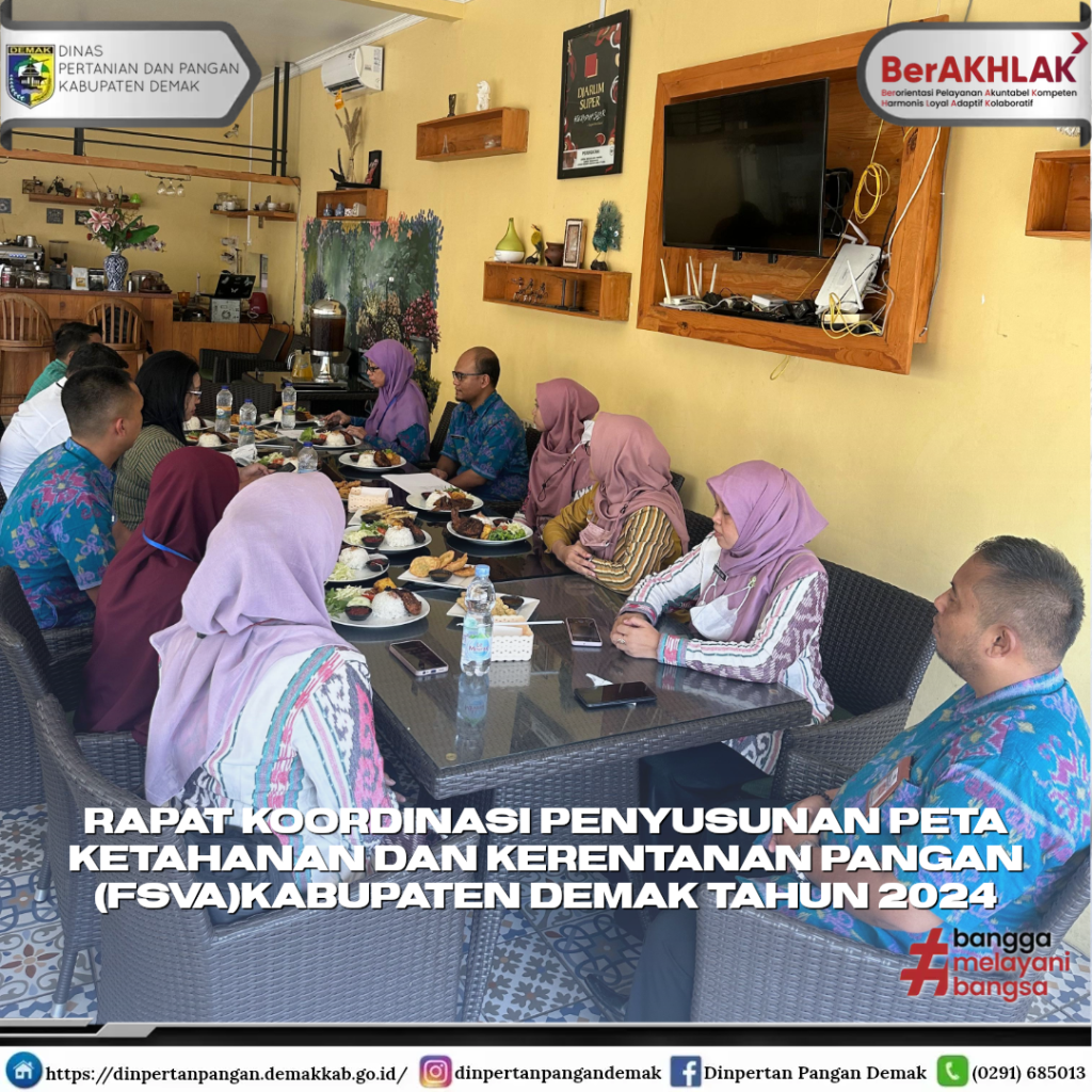Selasa, 25 Juni 2024 Bidang Ketahanan Pangan melakukan Rapat Koordinasi Penyusunan Peta FSVA Kabupaten Demak Tahun 2024 di Reinz Cafe. Peserta rapat terdiri dari Bidang Ketahanan Pangan dan tim penyusun FSVA Kabupaten Demak tahun 2024. Hasil Rapat Koordinasi bahwa data yang dibutuhkan dalam penyusunan peta FSVA tahun 2024 sudah ada. Namun, ada beberapa data yang sudah tidak dihitung lagi pada OPD terkait, seperti data rumah tangga. Kemudian, untuk data luas lahan Pertanian dan Sarana Prasarana Penyediaan Pangan hanya ada di tahun 2021. Untuk itu, akan dikoordinasikan lebih lanjut dengan Provinsi. Sehingga, diharapkan Peta FSVA Kabupaten Demak Tahun 2024 dapat tersusun dengan akurat.
