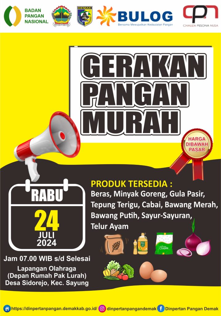 Dalam rangka memeriahkan Hari Ulang Tahun Badan Pangan Nasional (Bapanas) yang ke-3, serta upaya Kabupaten Demak dalam menjaga stabilisasi dan pasokan harga pangan Dinas Pertanian dan Pangan mengadakan Gerakan Pangan Murah (GPM) yang dilaksanakan oleh Bidang Ketahanan Pangan. Gerakan Pangan Murah akan dilaksanakan di Lapangan Olahraga (Depan Rumah Pak Lurah) Desa Sidorejo Kecamatan Sayung yang pada tanggal 24 Juni 2024 Pukul 07.00 WIB – Selesai.