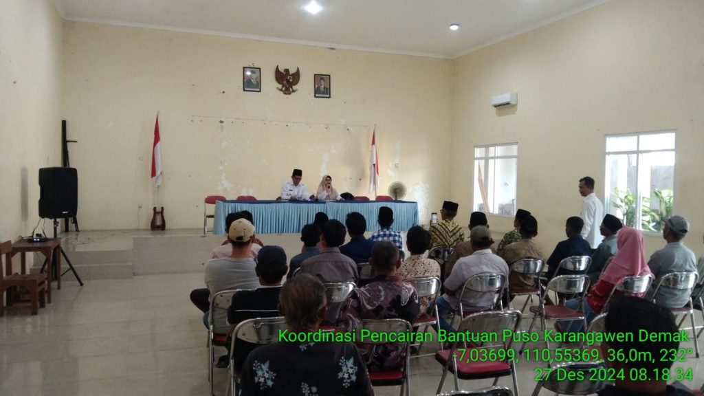 Pada hari Senin, 30 Desember 2024 pukul 09.30 – 11.30 berlangsung pencairan bantuan stimulan banjir tahun 2023 di Balai Desa Kuripan Kec. Karangawen Kab. Demak. Rangkaian kegiatan ini dimulai dengan pencairan dana di BNI Demak oleh perwakilan terdampak yang sudah ditunjuk, dengan didampingi dinas (korluh), perangkat desa, Babinsa, Bhabinkamtibmas, dan BPBD.