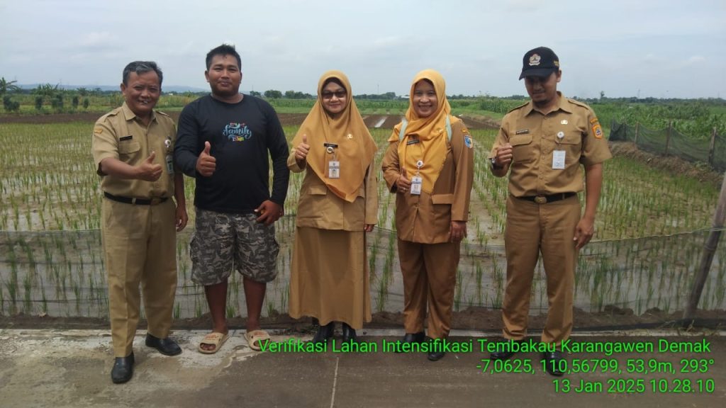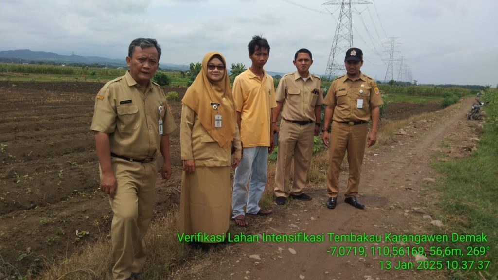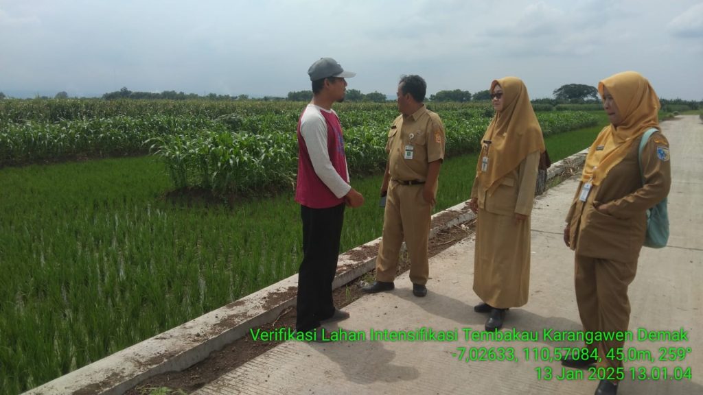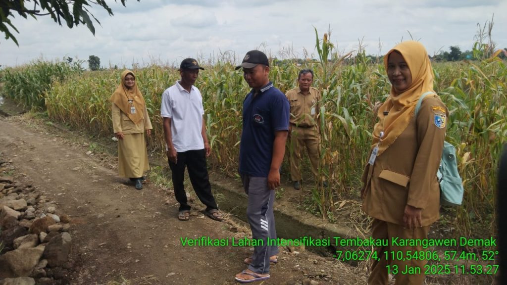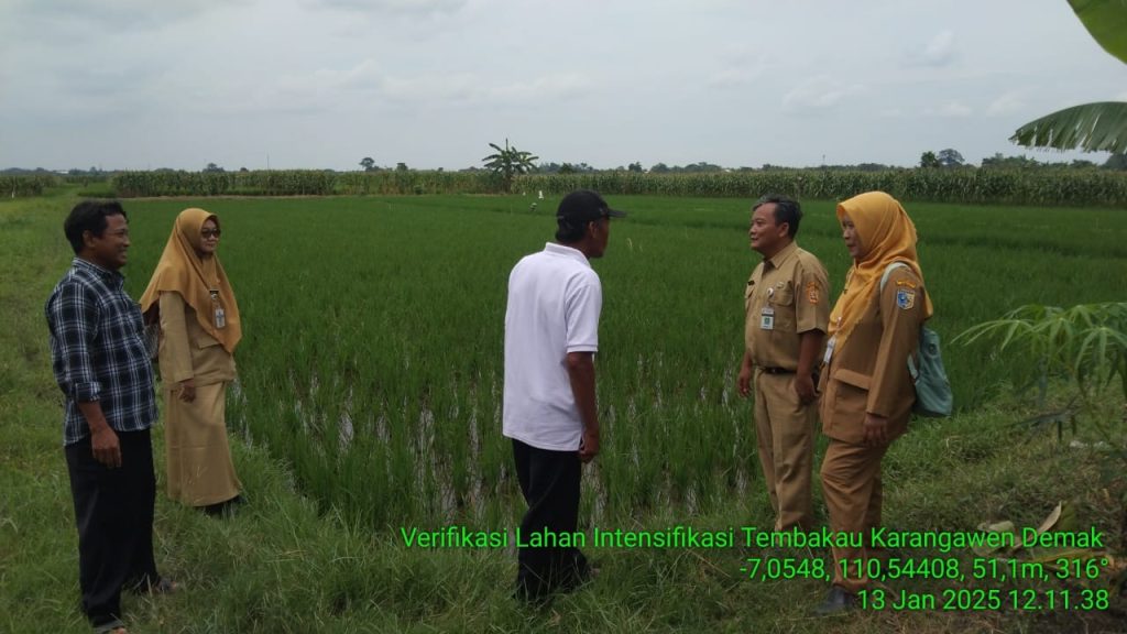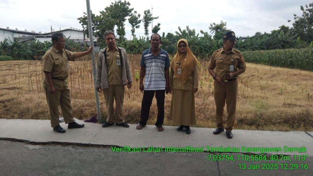 Pada hari Senin, 13 Januari 2025, telah dilaksanakan kegiatan verifikasi lahan faktual untuk program intensifikasi tembakau di Kecamatan Karangawen. Kegiatan ini melibatkan tim dari bidang perkebunan Provinsi Jawa Tengah, penyuluh pertanian lapangan (PPL) BPP Karangawen, serta pengurus kelompok tani yang lahannya sedang diverifikasi.