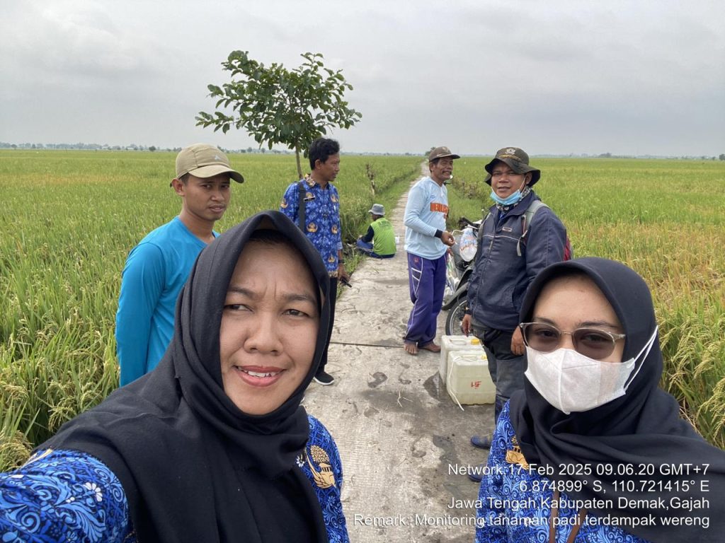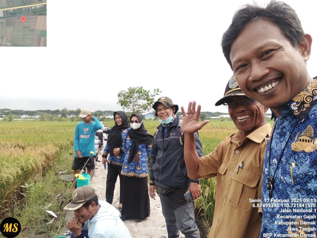 Demak, 17 Februari 2025 – Penyuluh Pertanian Lapangan Muhammad Sumedi, Endang Dwi Astuti, Sri Budi Wijayanti, bersama dengan POPT Ragil Gunarto, melakukan monitoring hama wereng batang coklat (WBC) di Poktan Semboja, Desa Sedo, Kecamatan Demak. Kegiatan tersebut turut melibatkan petani setempat guna mengidentifikasi kondisi tanaman padi yang terdampak oleh serangan hama.