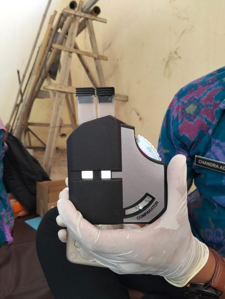 Bahan-bahan yang digunakan dalam pengujian ini adalah akuades dan empat sampel beras yang berasal dari Gapoktan, yaitu beras Gapoktan Sido Makumur dari Desa Surodadi Kecamatan Gajah, beras Gapoktan Tlogo Makmur dari Desa Tlogorejo Kecamatan Karangawen, beras Gapoktan Sumber Makmur dari Desa Sumberejo Kecamatan Bonang, dan beras Gapoktan Catur Tani dari Desa Trengguli Kecamatan Wonosalam. Sementara, untuk alat-alat yang digunakan untuk uji Chlorine meliputi, form hasil uji lab, 1 batang pengaduk, 1 sikat pembersih, 1 disk parameter, 2 x 10 ml vial/kuvet. Komparator, serta tablet reagen DPD No1 dan DPD No3. Dan alat-alat yang digunakan untuk uji cepat Pestisida meliputi 4 beaker glass, 4 pipet, Pestisida Test Kit model card.