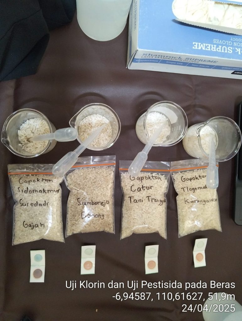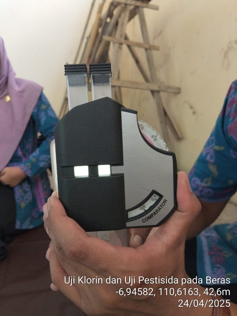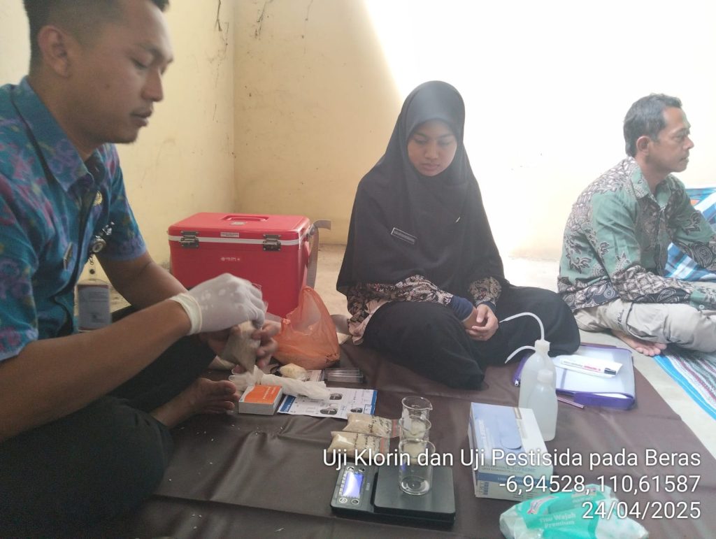 Pada hari Kamis, 24 April 2025 Bidang Ketahanan Pangan melakukan uji klorin dan uji pestisida pada beras. Pengujian dilakukan oleh Analis ketahanan pangan Adhe Chandra Purnomo, S.TP dan Susi Oxyvia Rosenansi, S.TP. Uji klorin dan Uji Pestisida pada beras dilakukan untuk mengetahui bahan pangan utama yang berasal dari beras aman dikonsumsi masyarakat, sehingga terhidar dari penyakit. “Uji klorin pada beras dilakukan untuk mengetahui apakah pangan utamanya yang berasal dari beras aman dikonsumsi masyarakat, bebas dari residu kimia dan melindungi masyarakat secara umum” Kata Kepala Bidang Ketahanan Pangan.