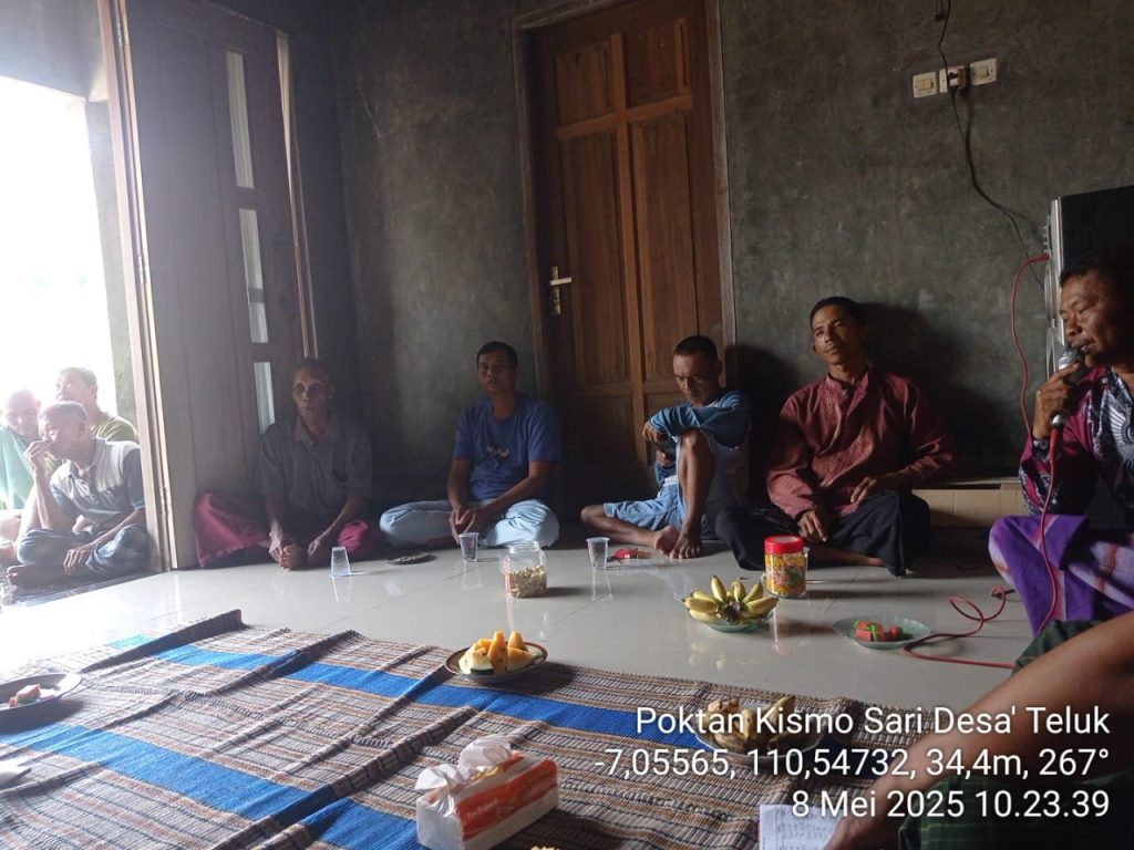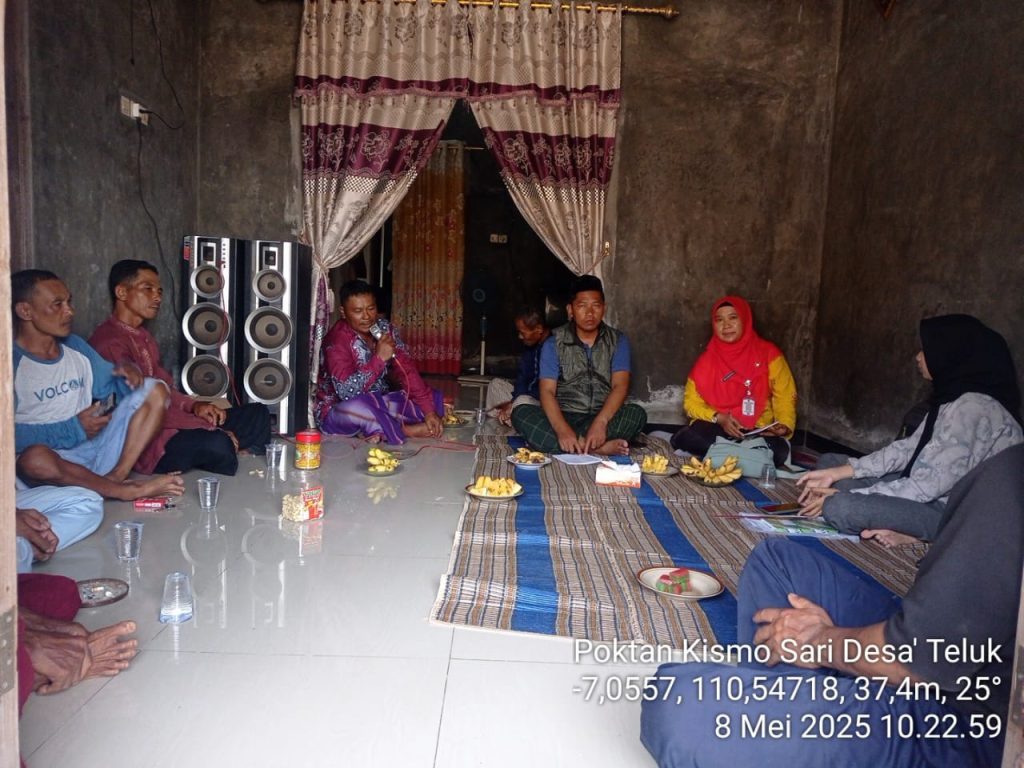 Pada hari Kamis, 8 Mei 2025, Kelompok Tani (Poktan) Kismo Sari Desa Teluk, Kecamatan Karangawen, melaksanakan pertemuan triwulanan di rumah sekretariat kelompok. Kegiatan yang berlangsung dari pukul 10.00 hingga 12.00 ini dihadiri oleh 25 orang petani anggota kelompok serta Penyuluh Pertanian Lapangan (PPL) Desa Teluk, Ibu Rini Handayani, S.Pt.