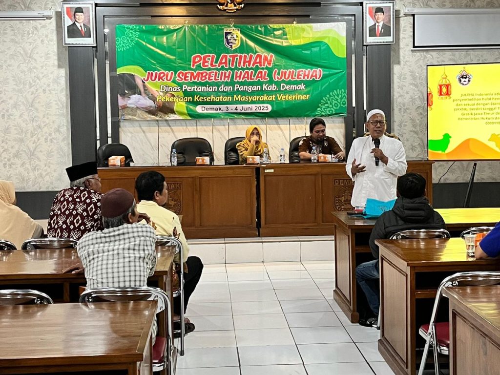PKH – Demak, 3–4 Juni 2025 — Dalam upaya mendukung penyediaan pangan yang halal, sehat, dan sesuai dengan prinsip syariat Islam, Dinas Pertanian dan Pangan (Dinputan) Kabupaten Demak menyelenggarakan Pelatihan Juru Sembelih Halal (Juleha) bagi para pelaku usaha pemotongan hewan. Kegiatan yang berlangsung selama dua hari ini dilaksanakan di Kabupaten Demak dan diikuti oleh para juru sembelih dari Rumah Potong Hewan (RPH), jagal mandiri, serta pelaku usaha makanan berbahan dasar hewan dari wilayah Demak dan sekitarnya.