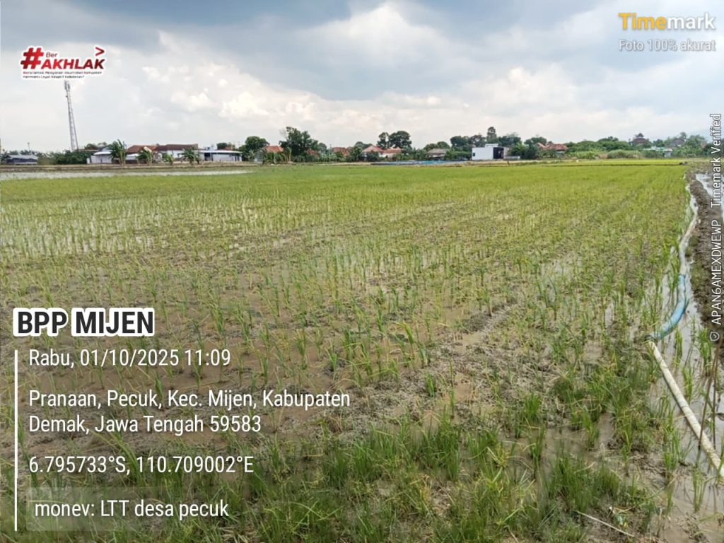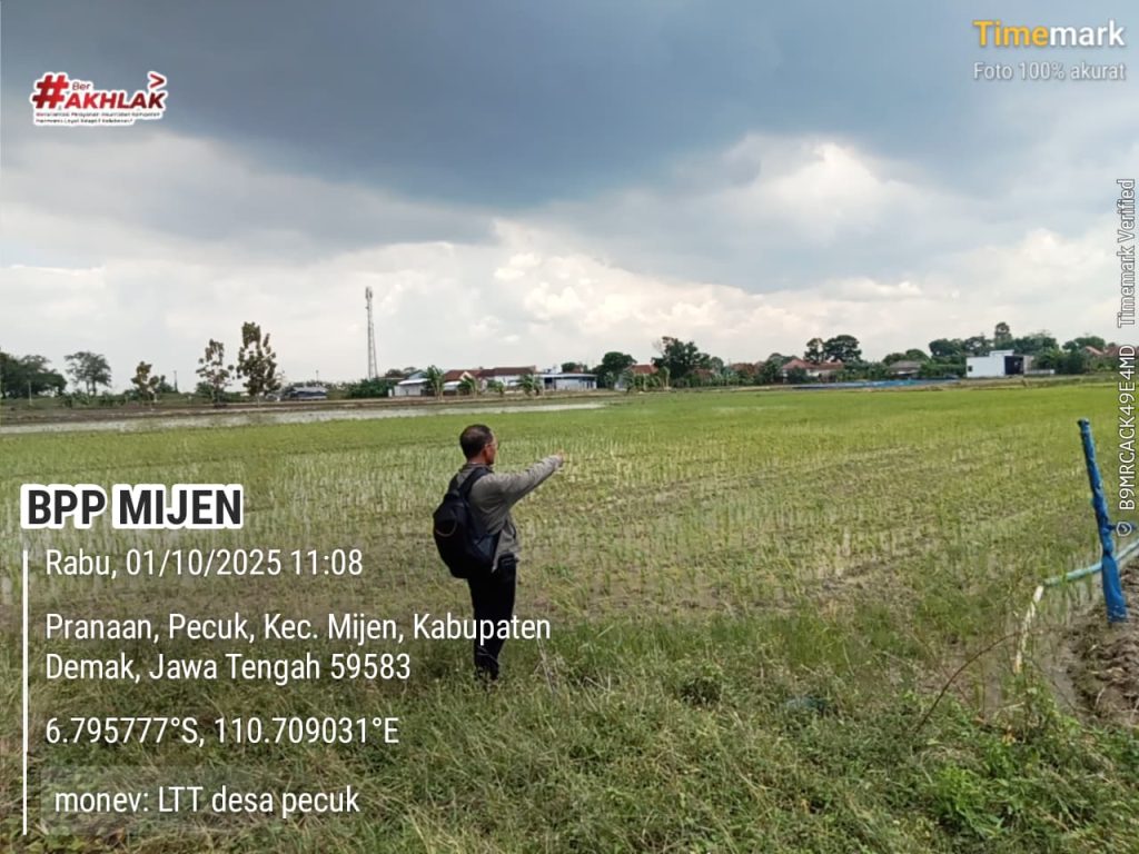 Desa Pecuk, Kecamatan Mijen – Rabu, 1 Oktober 2025. Penyuluh Pertanian Lapangan (PPL) Kecamatan Mijen melaksanakan kegiatan monitoring Luas Tambah Tanam (LTT) Padi Musim Tanam (MT) I di lahan pertanian Desa Pecuk. Kegiatan ini dilakukan untuk memastikan proses tanam berjalan sesuai target dan jadwal yang telah ditetapkan.