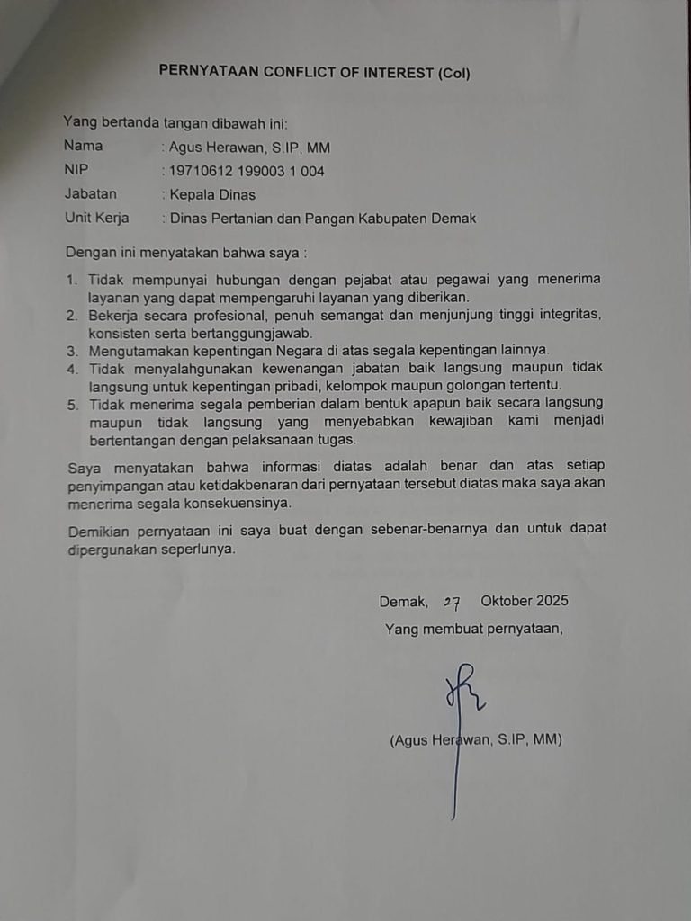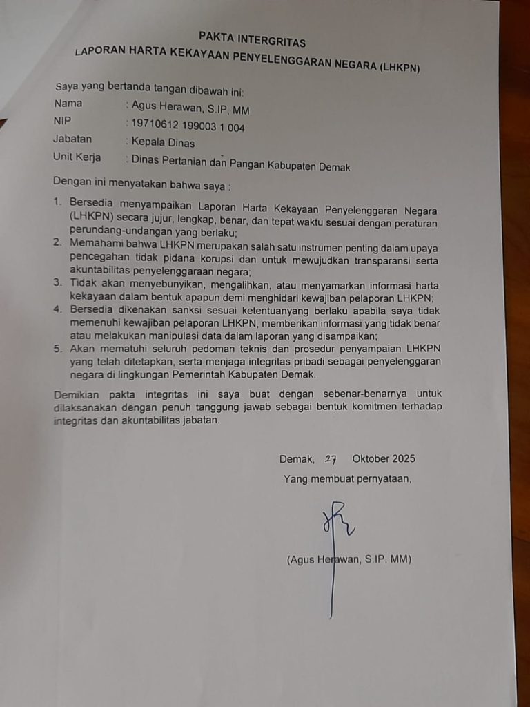 Demak, 27 Oktober 2025 — Dinas Pertanian dan Pangan Kabupaten Demak melaksanakan kegiatan penandatanganan Pakta Integritas oleh seluruh pegawai sebagai bentuk nyata komitmen dalam mewujudkan tata kelola pemerintahan yang berintegritas, transparan, dan akuntabel.