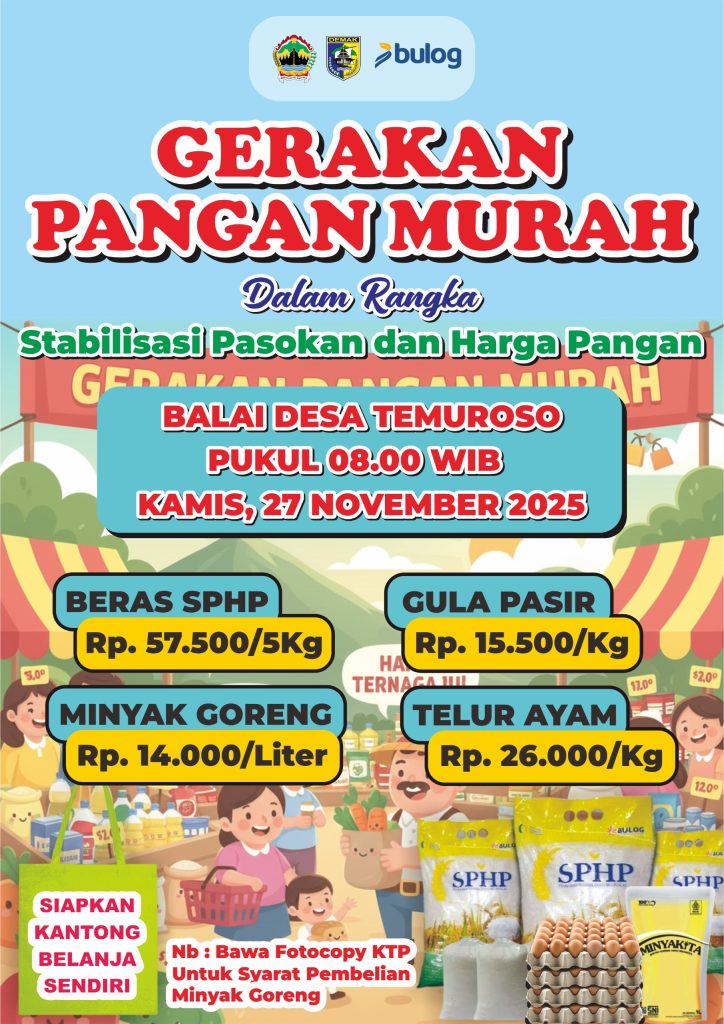 Demak, 27 November 2025 – Dalam rangka memperingati Hari Korpri Nasional serta mendukung upaya stabilisasi pasokan dan harga pangan, Dinas Ketahanan Pangan Provinsi Jawa Tengah menyelenggarakan Gerakan Pangan Murah (GPM) di Kabupaten Demak. Kegiatan ini dilaksanakan serentak pada Kamis, 27 November 2025, dan menjadi salah satu langkah strategis untuk membantu masyarakat memperoleh pangan pokok dengan harga terjangkau.