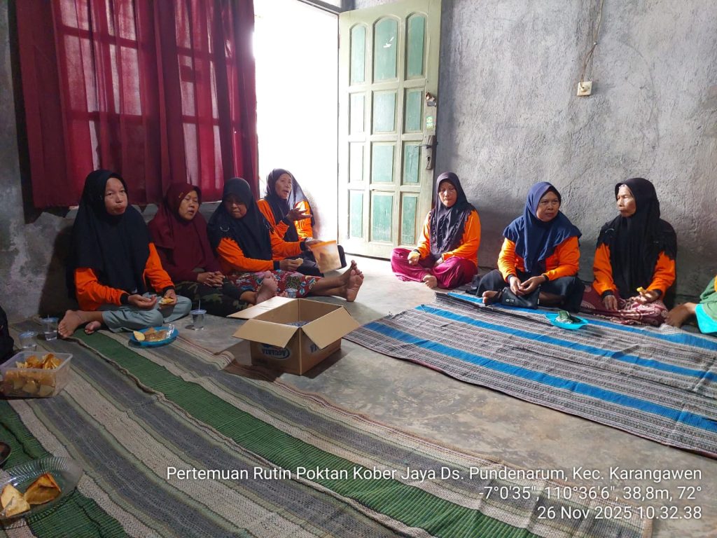 Karangawen, 26 November 2025 – Kegiatan penyuluhan pertanian dilaksanakan di Rumah Ibu Wasmi selaku bendahara Poktan Kober Jaya, Desa Pundenarum, Kecamatan Karangawen, pada Rabu, 26 November 2025 pukul 10.30 WIB. Kegiatan ini merupakan pertemuan rutin Poktan Kober Jaya yang dilaksanakan setiap Rabu Paing (selapanan) sebagai media koordinasi dan peningkatan kapasitas petani.