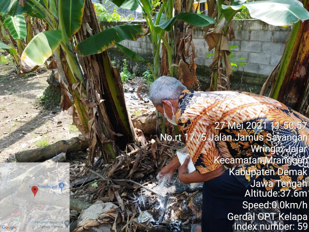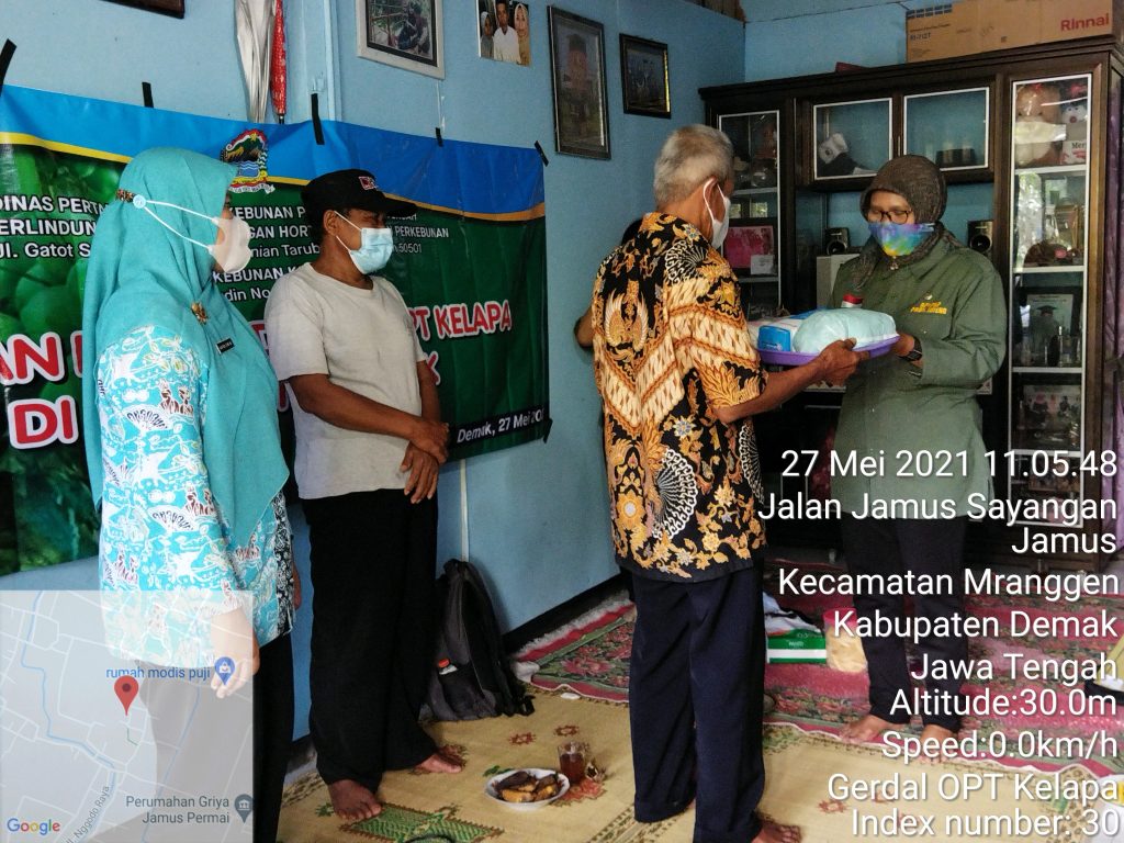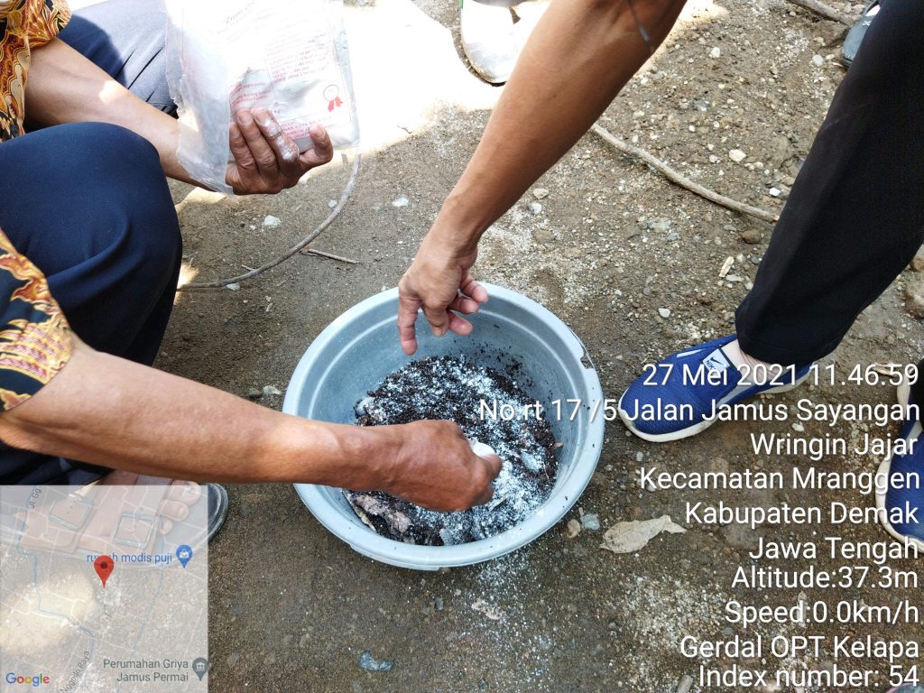 Pada hari Kamis (17/05/2021) Dinas Pertanian dan Pangan Kabupaten Demak menggandeng Balai Perlindungan Tanaman Pangan Hortikultura dan Perkebunan (BPTPHP) Dinas Pertanian dan Perkebunan Provinsi Jawa Tengah bersama Kelompok Tani Sido Makmur Desa Jamus Kecamatan Mranggen, melakukan gerakan pengendalian (gerdal) OPT Kelapa dengan pengaplikasian agensia hayati jamur Metarhizium anisopliae guna menekan penyebaran serangan kumbang tanduk. Hadir dalam acara gerdal OPT tersebut, yaitu petugas dari laboratorium BPTPHP Distanbun Provinsi Jawa Tengah, Kasi Plt. Tanaman Tahunan bidang perkebunan Dinpertan berserta staf, koordinator P3K Kecamatan Mranggen dan PPL Desa Jamus, serta anggota gapoktan Sido Makmur Desa Jamus.