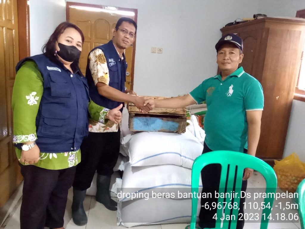 PPL Kecamatan Sayung Dinas Pertanian dan Pangan Kabupaten Demak, Kepala Dinas Dinpertan Pangan Agus Herawan, S.IP, M.M beserta Bupati Demak dr. Hj. Eisti’anah, S.E melakukan pendampingan penyaluran bantuan di Desa terdampak banjir di kecamatan Sayung. Proses pendistribusi beras cadangan pemerintah sebanyak 1000 kg beras + 2 krat telor per lokasi dapur umum di 5 Desa, diantaranya yaitu Desa Kalisari, Desa Prampelan, Tambakroto, Desa Loireng dan Desa Sidorejo) Kecamatan Sayung Kabupaten Demak.