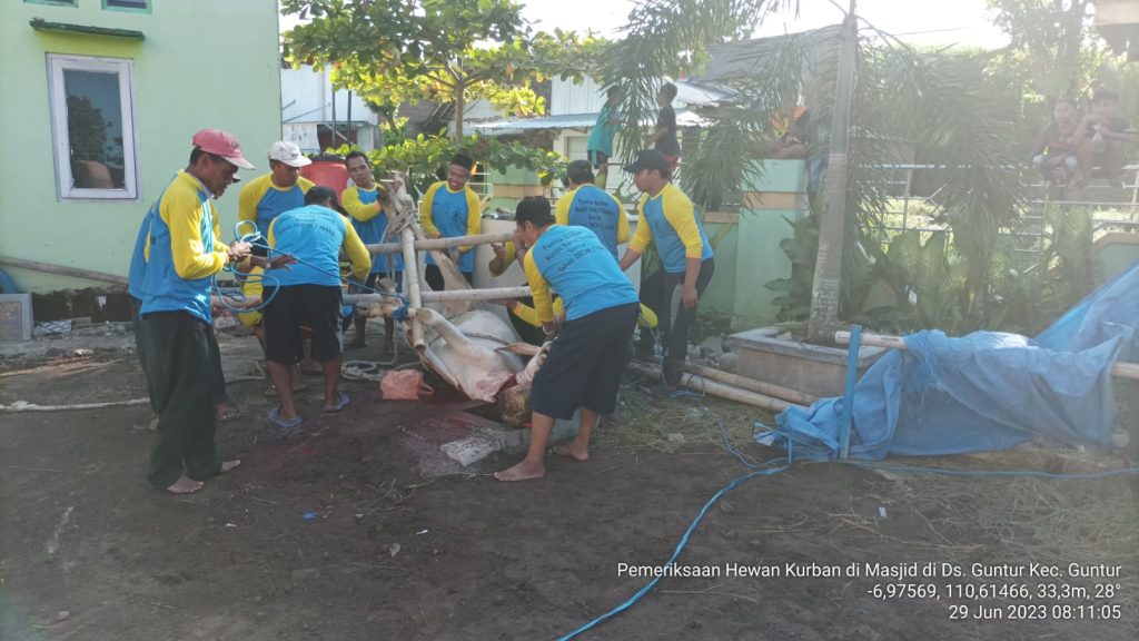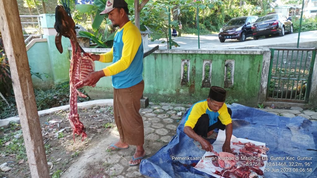 Tanggal 29 Juni 2023 yang bertepatan dengan hari raya idul adha, warga muslim di kabupaten demak khususnya di kecamatan Guntur. Berqurban ternak terutama sapi, kambing maupun kerbau. Petugas Peternakan Kecamatan Guntur (P2K) Bapak Ratna Arif Wibawa, S.Pt melaksanakan giat pemeriksaan postmortem pada ternak ruminansia tersebut. Sebelum pelaksanaan pemeriksaan postmortem 3 hari sebelum pelaksanaan qurban dilaksanakan maka perlu adanya pemeriksaan antemortem untuk memastikan bahwa ternak tersebut memenuhi unsur ASUH (Aman, Sehat, Utuh dan Halal) untuk di qurbankan dan tidak berbahaya bagi ternak itu sendiri maupun kepada manusia.