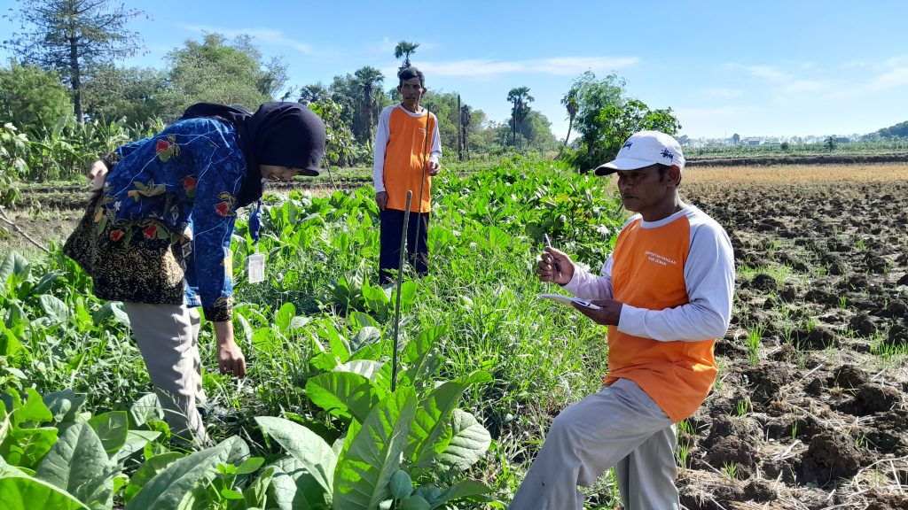 Pada pertemuan kedua ini, peserta diajak ke lokasi lahan budidaya untuk mengamati tanaman tembakau umur 35 HST, meliputi kondisi tanaman, kondisi air, kondisi tanah, kelembaban, keberadaan hama penyakit dan musuh alami dan permasalahan apa saja yang ada di lahan.