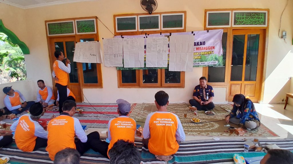 Rabu, 12 Juli 2023 Bidang Perkebunan Dinpertan Pangan Kab. Demak menyelenggarakan Pelatihan PHT Tanaman Tembakau di Kelompok Tani Dadi Mulyo Desa Candisari Kec. Mranggen. Pertemuan kali ini merupakan yang kedua, dihadiri oleh 20 peserta yang merupakan anggota Kelompok Tani Dadi Mulyo