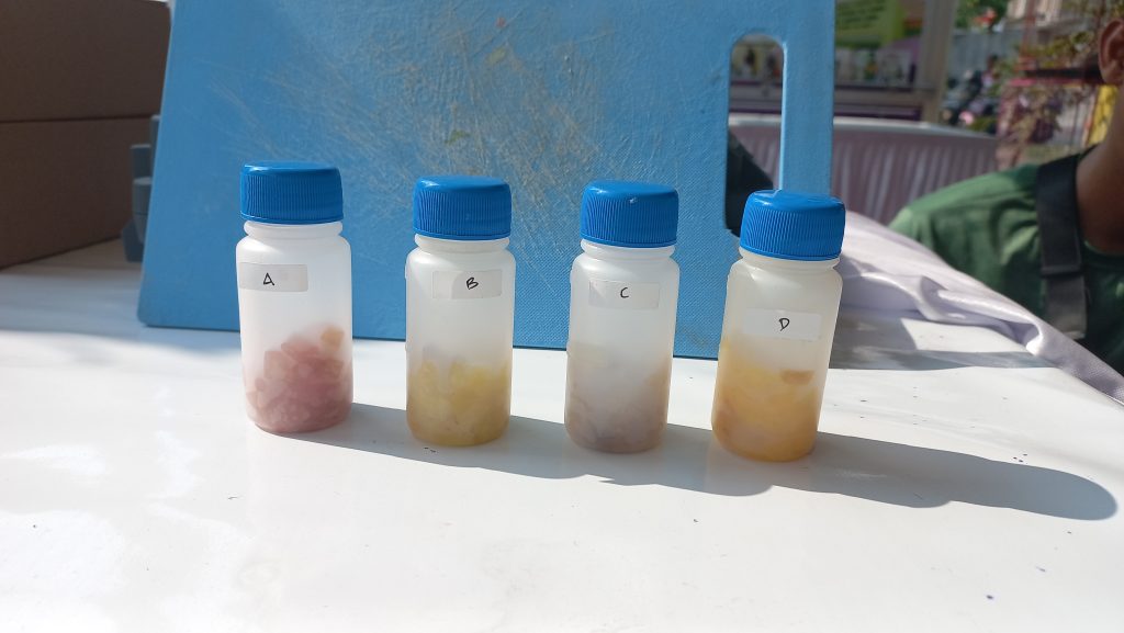 Sampel pengujian residu pestisida meliputi: (A) Buah Jambu Citra, (B) Buah Belimbing dari Demak, (C) Buah Jambu Madu Deli dari Demak, (D) Buah Blewah dari Guntur. Sementara, sampel yang digunakan untuk uji klorin, yaitu Beras dari Karangawen.