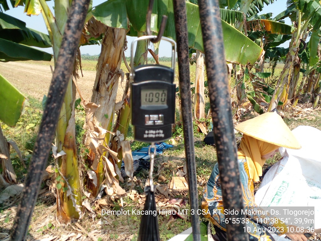 Musim panen kacang hijau di MT 3 makin meluas. Kamis, 10 Agustus 2023 PPL BPP Wonosalam melaksanakan ubinan komoditas kacang hijau. Ubinan merupakan pengambilan sample pada lahan dengan luas 2,5 x 2,5 m kemudian dipanen dan dihitung hasilnya sehingga dapat memprediksi produksi maupun produktivitas. Ubinan dilaksanakan di lahan kelompok tani Sido Makmur desa Tlogorejo, Kecamatan Wonosalam di lahan milik Mukorobin dan Saiful.