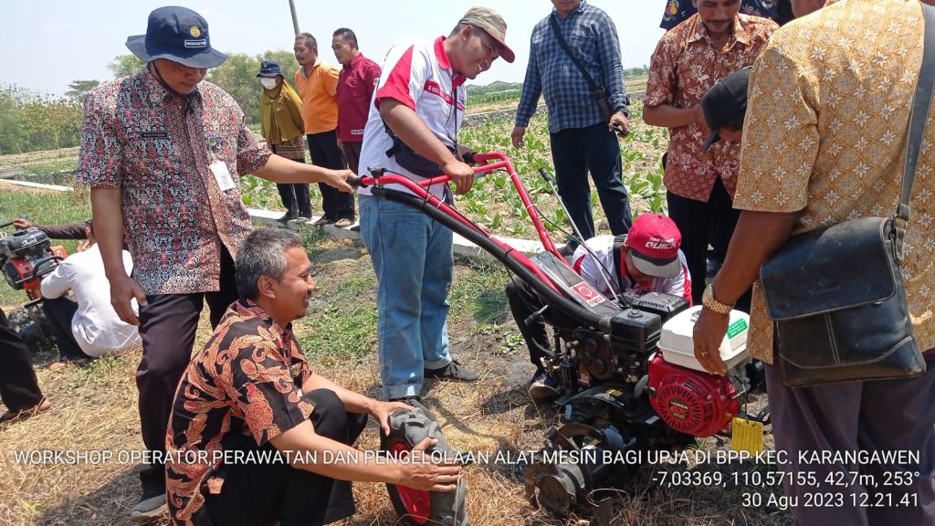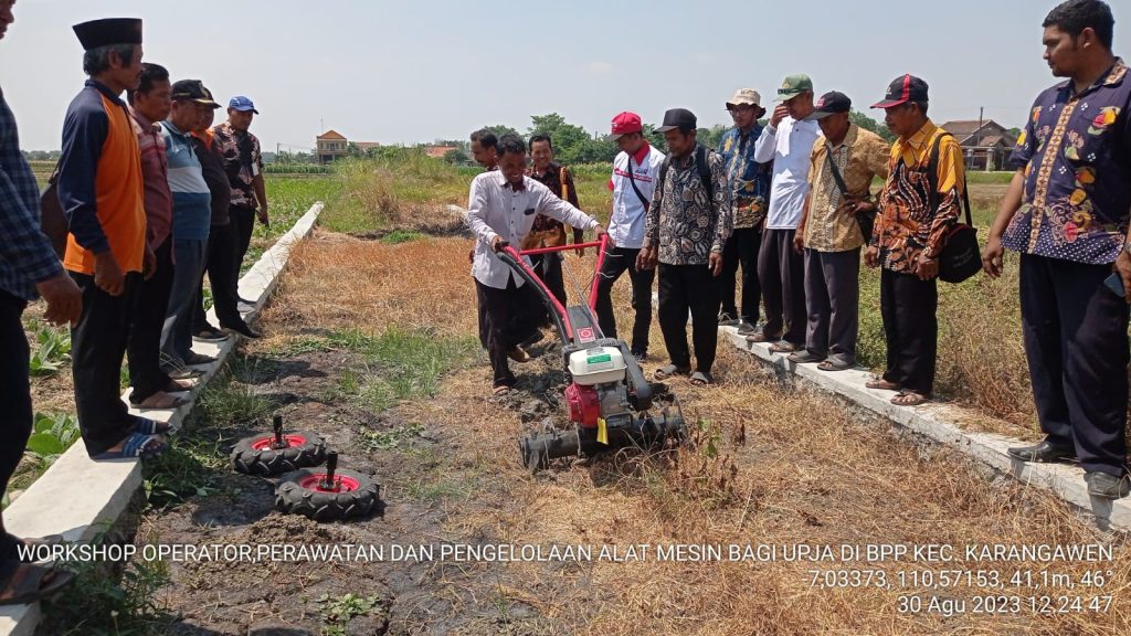 Kegiatan ini diadakan oleh Dinas Pertanian dan Perkebunan (DISTANBUN) Provinsi Jawa Tengah Bidang Prasarana dan Sarana. Tujuan kegiatan ini adalah untuk meningkatkan kompetensi pengurus poktan, pengelola UPJA, dan penyuluh pertanian. Kegiatan ini bertujuan untuk memberikan bimbingan atau pelatihan kepada kelompok tani, penyuluh pertanian agar dapat menggunakan, melakukan perawatan, dan pengelolaan alat mesin pertanian. (BPP Karangawen)