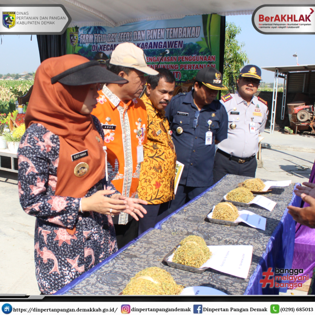 Rabu, 13 September 2023 Dinas Pertanian dan Pangan Kabupaten Demak menyelenggarakan Farm Field Day (FFD) dan Panen Tembakau di Kecamatan Karangawen Kabupaten Demak. Acara panen tembakau bersama Bupati Demak, dr. Hj. Eisti’anah, S.E. ini dilaksanakan di lahan Kelompok Tani Sido Mulyo Desa Brambang.