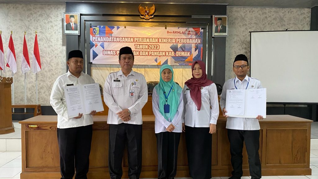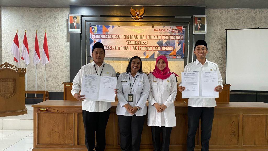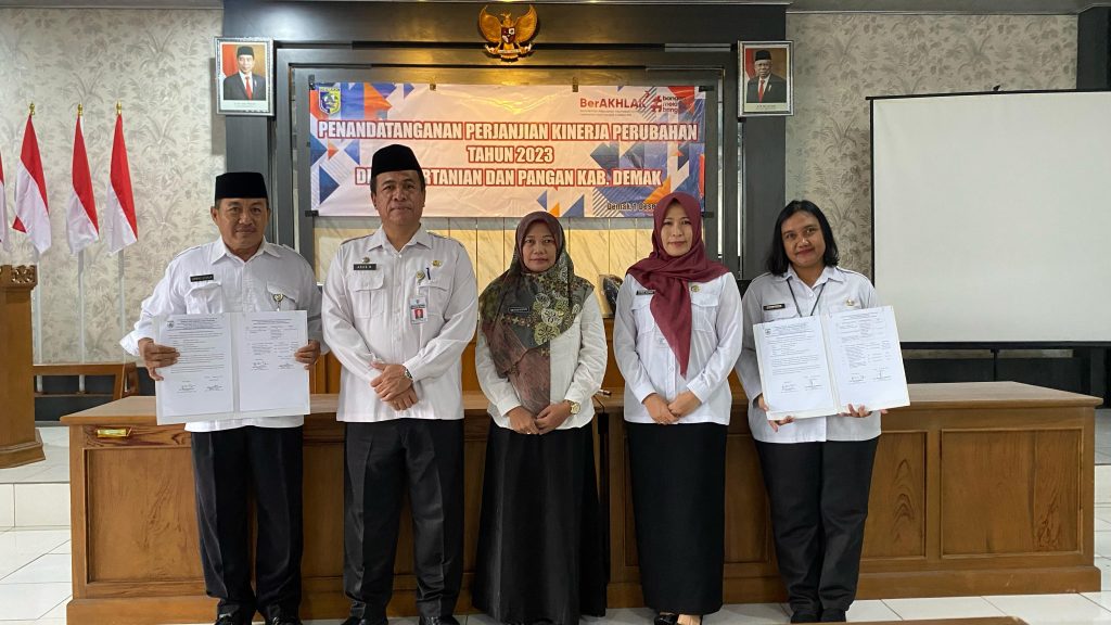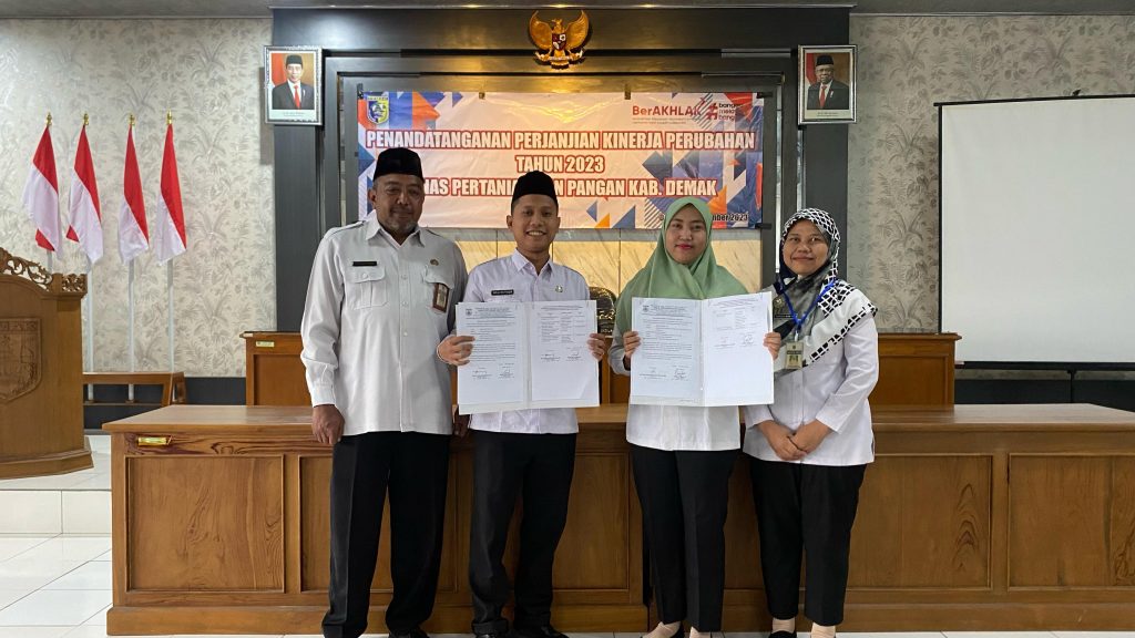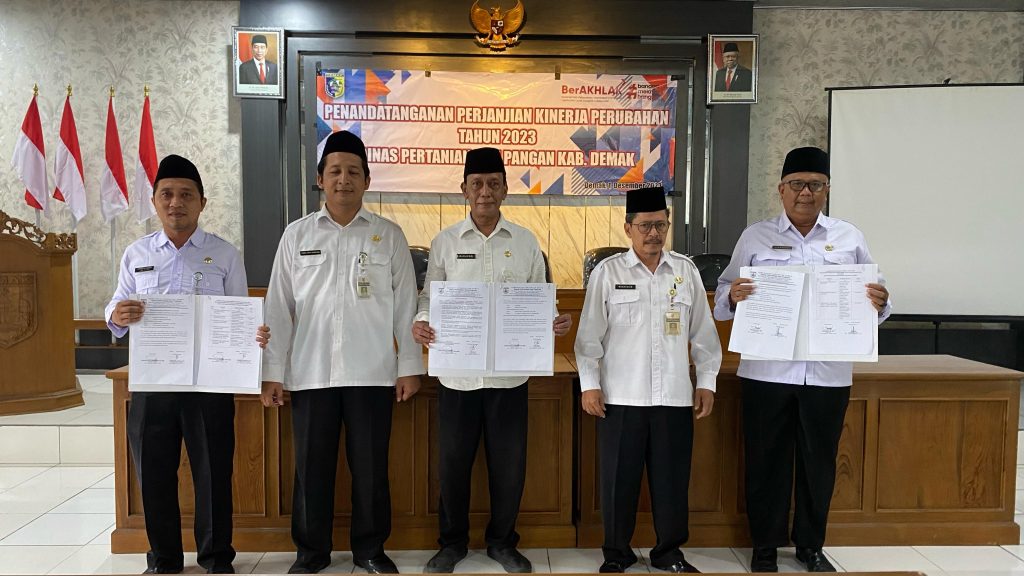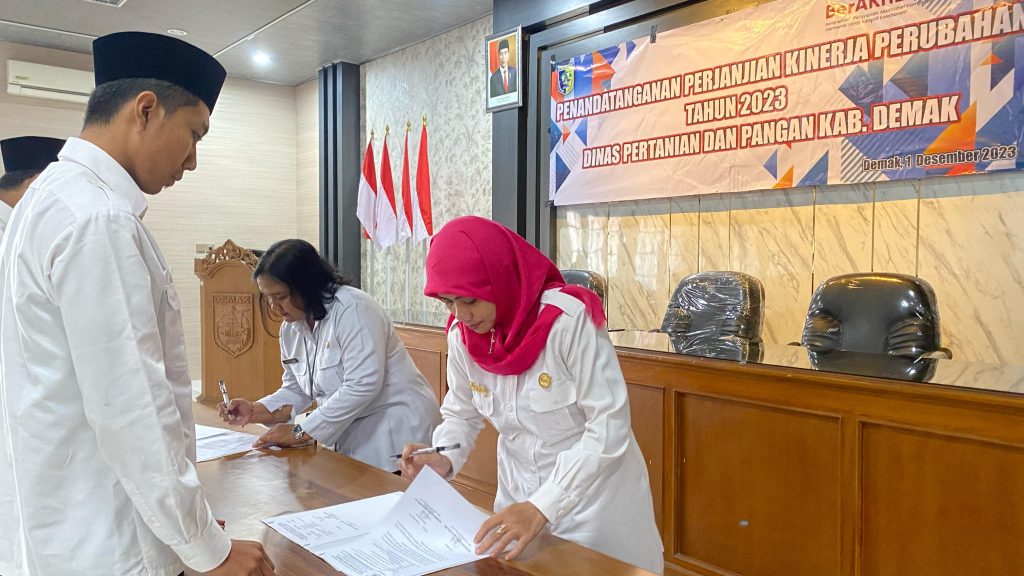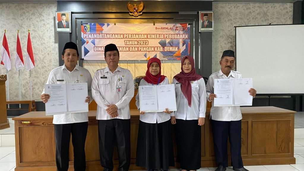 Demak, hari Jum’at tanggal 01 Desember 2023 Pukul 08.00 WIB bertempat di Ruang Pertemuan Dinas Pertanian dan Pangan Kabupaten Demak dilaksanakan kegiatan Penandatanganan Perjanjian Kinerja Perubahan Tahun 2023. Kegiatan tersebut dipimpin oleh Kepala Dinas Pertanian dan Pangan Kabupaten Demak Bapak Agus Herawan, S.IP, M.M. Dalam kegiatan tersebut dihadiri oleh Pegawai Aparatur Sipil Negara (ASN) dan Pegawai Non ASN di lingkungan Dinpertan Pangan Kab. Demak.