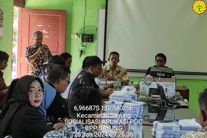 Kamis, 25 Januari 2024, bertempat di BPP Sayung, PT Pos Indonesia mengadakan kegiatan sosialisasi dan bimbingan teknis Aplikasi Pos Giro dan Cash (PGC) dengan narasumber Bapak Donny dan Bapak latief dari PT Pos Indonesia. Kegiatan ini dihadiri oleh 40 admin beras CPP Se-Kecamatan Sayung.