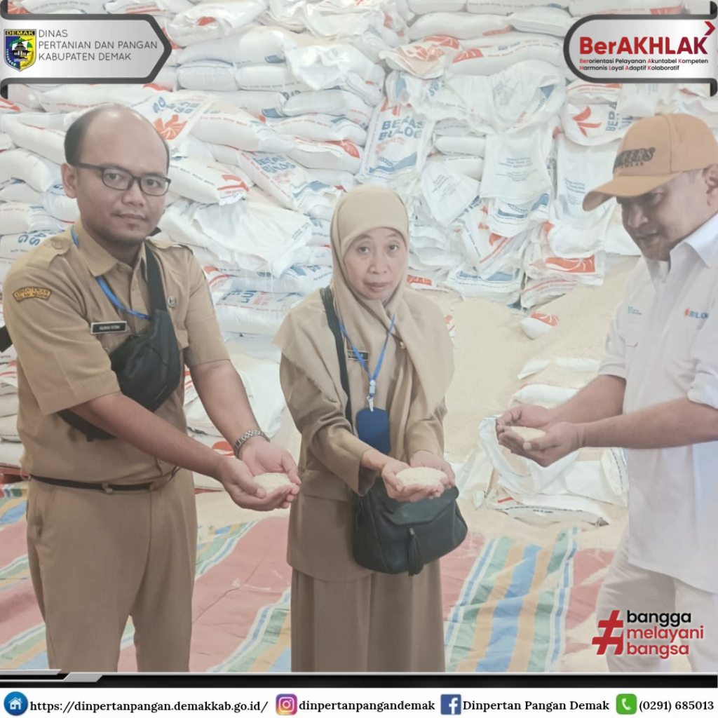 Demak – Dalam rangka penyaluran bantuan pangan CPB tahap I Bulan Januari, Bidang Ketahanan Pangan Dinas Pertanian dan Pangan Kabupaten Demak melakukan kegiatan Pemeriksaan Beras Bantuan Pangan CBP. Hal ini bertujuan untuk memastikan kualitas beras yang akan disalurkan kepada masyarakat dalam kondisi baik. Pemeriksaan Beras dilaksanakan pada Senin, 29 Januari 2024 di Gudang Bulog Katonsari Demak.