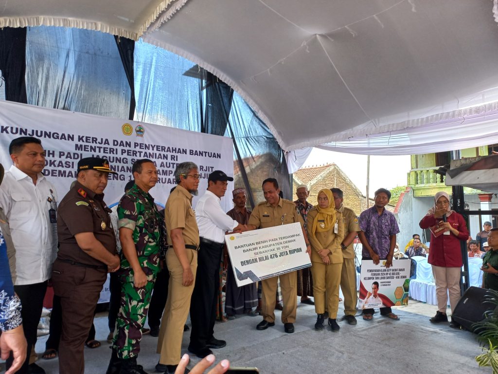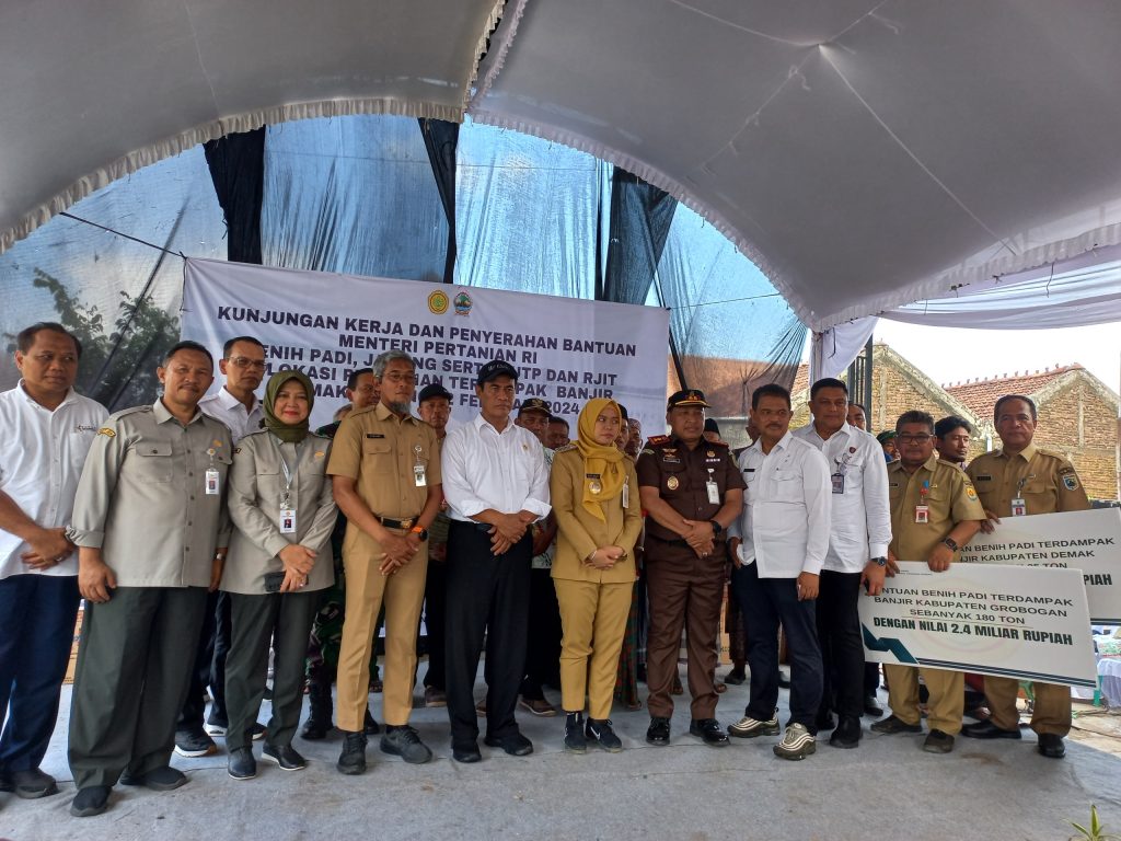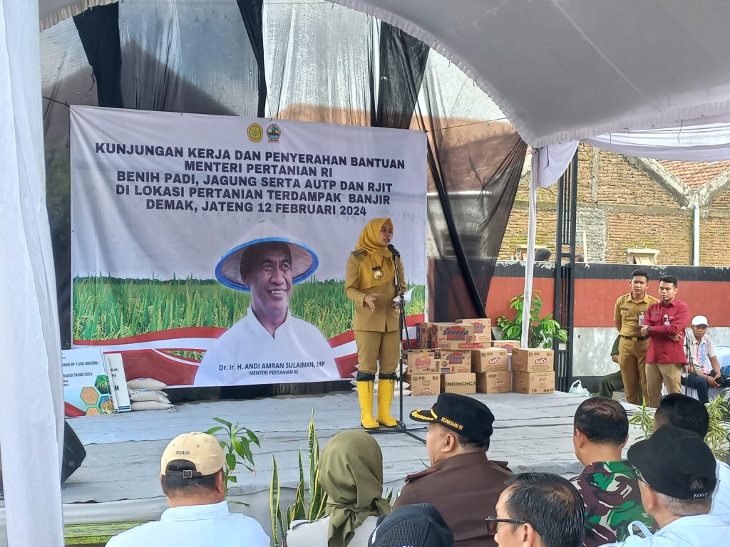 Demak – Menteri Pertanian Dr. Ir. H. ANDI AMRAN SULAIMAN, MP. bersama jajaran Pejabat Kementerian Pertanian melaksanakan kunjungan kerja dan penyerahan bantuan kepada petani yang terdampak banjir di 3 Kabupaten yaitu Kab. Demak, Kab. Kudus dan Kab. Grobogan. Kegiatan Kunjungan tersebut bertempat di Desa Ngaluran Kec. Karanganyar Kab. Demak Provinsi Jawa Tengah. Senin (12/02/2024).