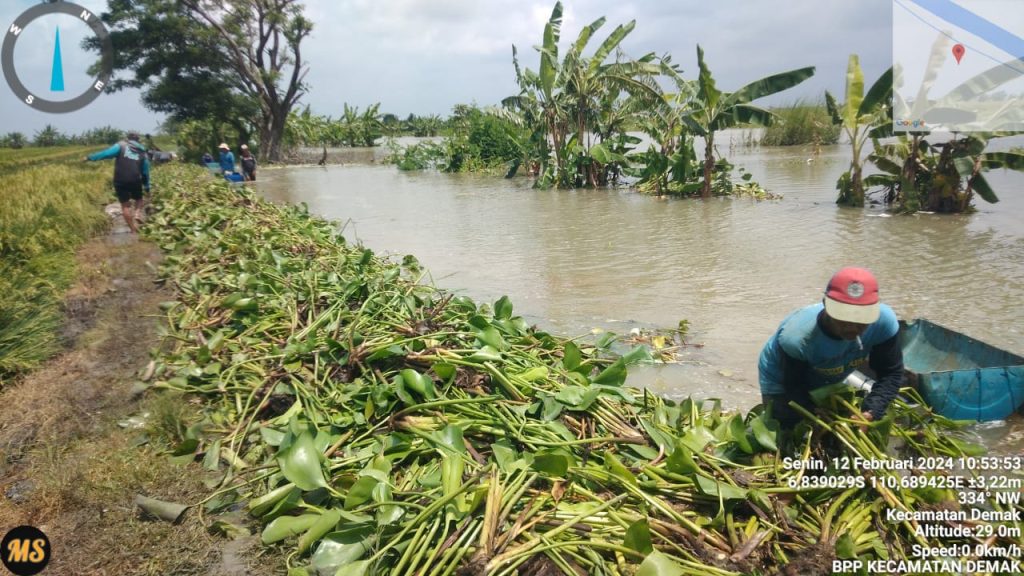 Demak – Poktan Sido Trisno dan Poktan Sido Dadi Desa Mulyorejo terdapat 4 titik kritis dampak limpasan dari sungai Gajah Kanal. Pada hari Senin (12/02) Kepala Desa Mulyorejo Suharsono bersama Pemerintah Desa dan Penyuluh Kecamatan Demak melakukan pantauan banjir.