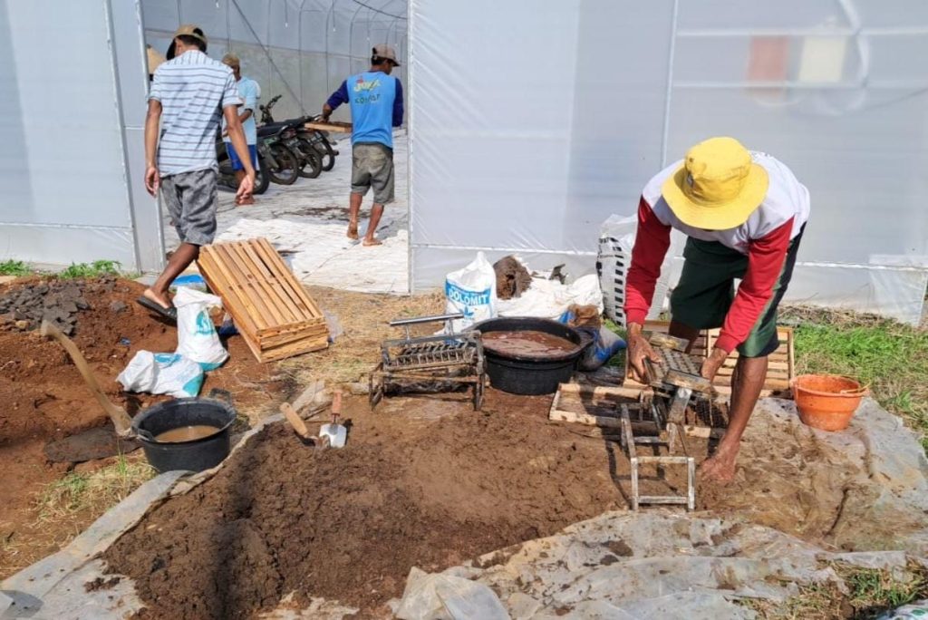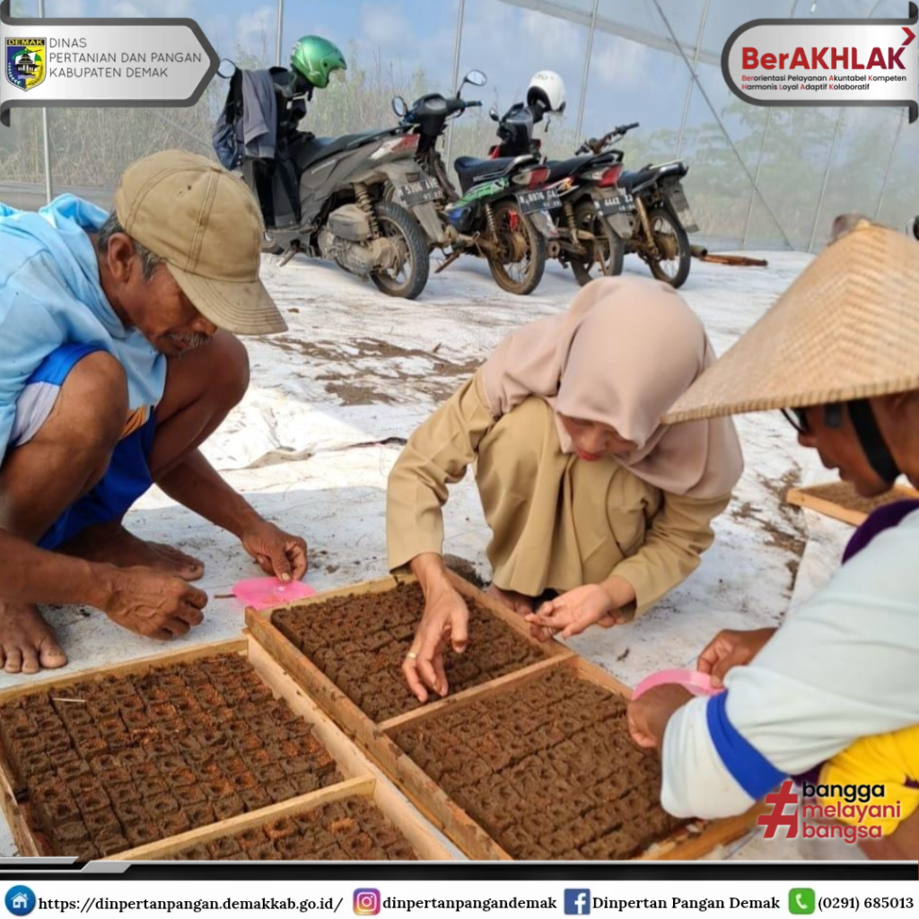 Mijen – M. Hatib, S.P. selaku PPL Kec. Mijen Wilbin Desa Pasir Kec. Mijen beserta rombongannya dan Poktan Tani Jaya Desa Pasir Kec. Mijen melaksanakan penyemaian benih cabai di Greenhouse Nursery Desa Pasir Kec. Mijen Kab. Demak Prov. Jawa Tengah, Senin (04/03/2024).